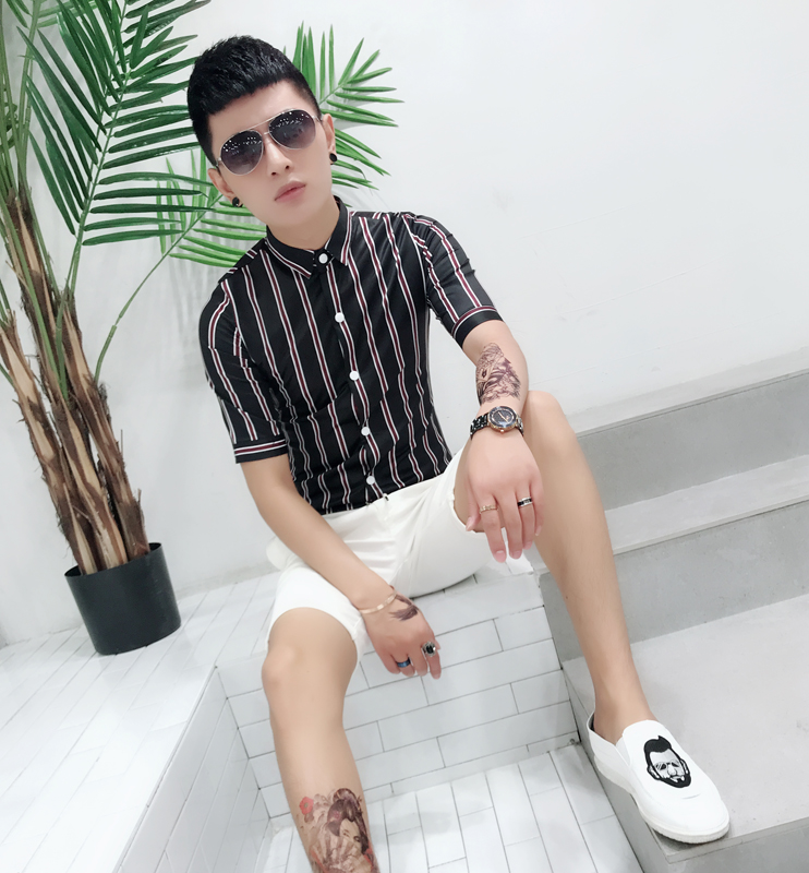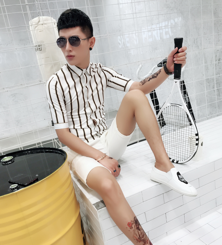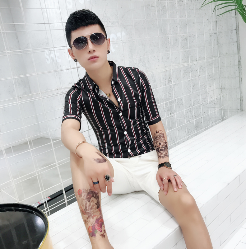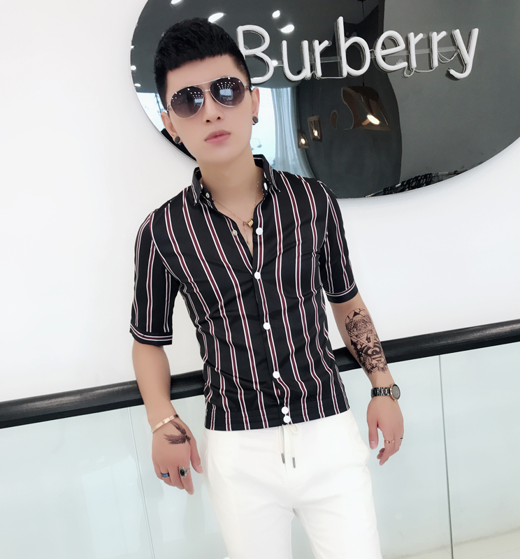 Five-point sleeve shirt men's striped summer thin nightclub trend handsome and slim men's mid-sleeve casual shirt short-sleeved