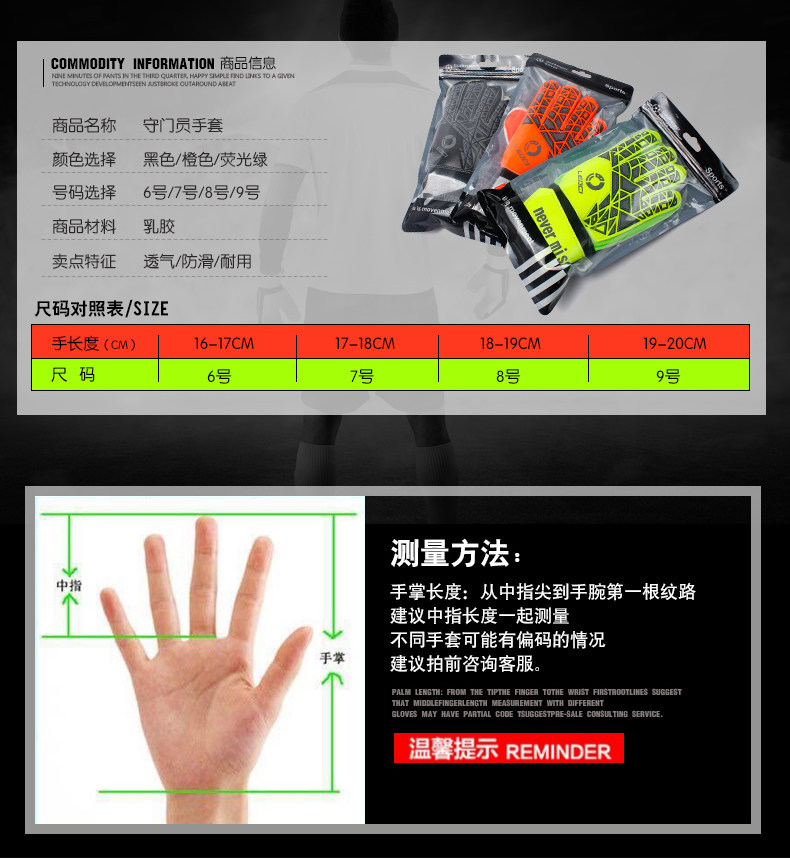 Black and white 6 16-17 gloves black and white 7 Number 17-18 gloves black and white 8 Number 18-19 gloves black and white 9 Number 19-20 gloves orange colour 6 16-17 gloves orange colour 7 Number 1
