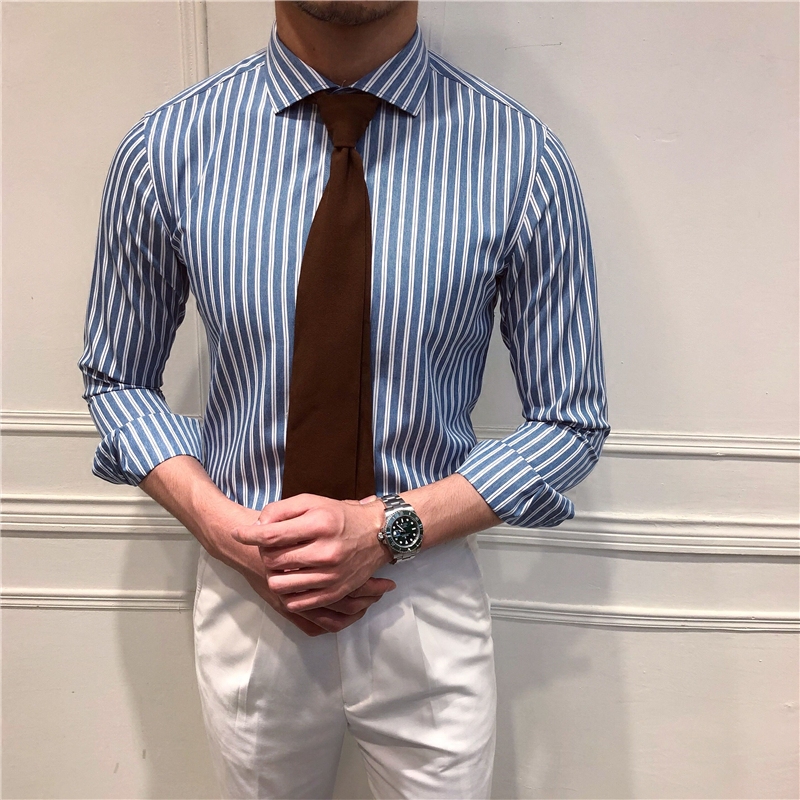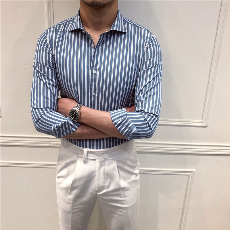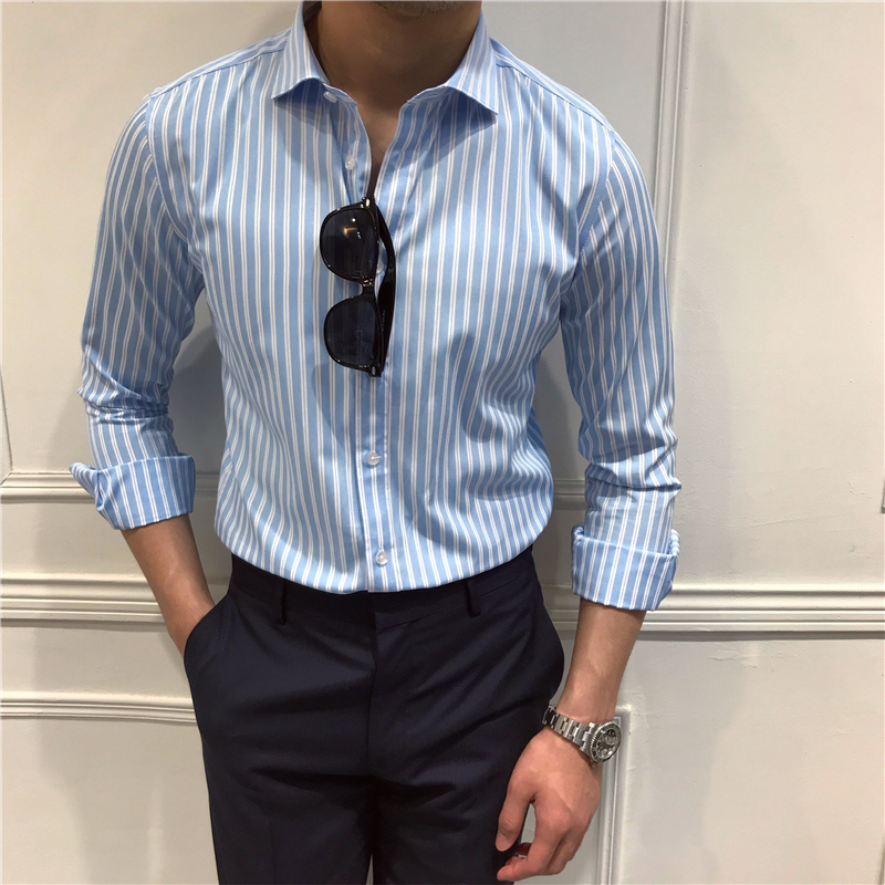 Mr Lu San Men's slim striped long-sleeved shirt British business fashion shirt Korean casual top trendsetter
