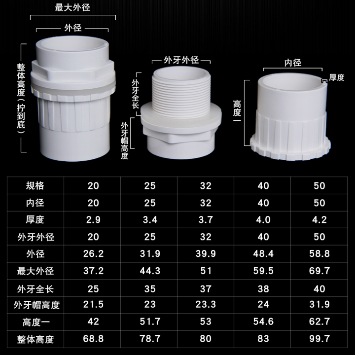 20mm (4 points) inner and outer silk joints 25mm (6 points) inner and outer silk joints 32mm (1 inch) inner and outer silk joints 40mm (1 2 inch) inner and outer silk joints 50mm (1 inch)
