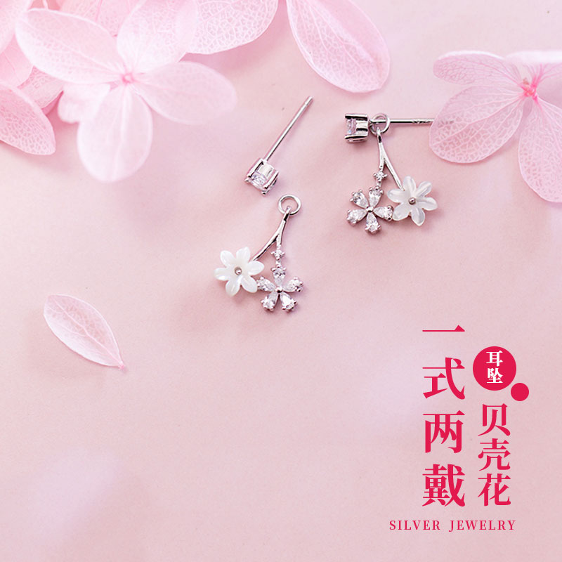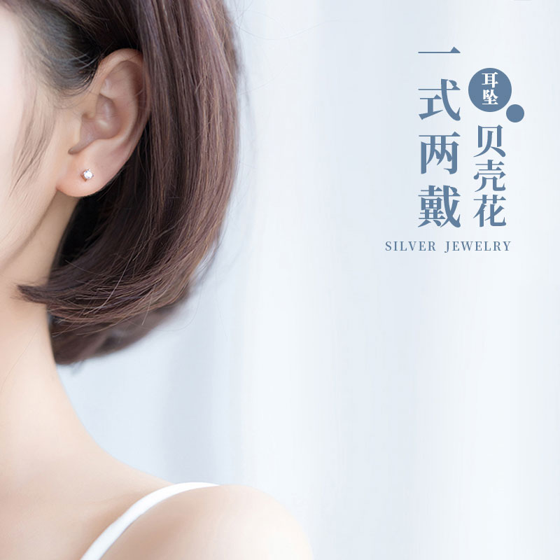 Cat hibernation light and luxurious two-wearing shell flowers rear-hanging ear-needle female s925 pure silver ear ring Japan-ROK minimalist temperament 100 lap