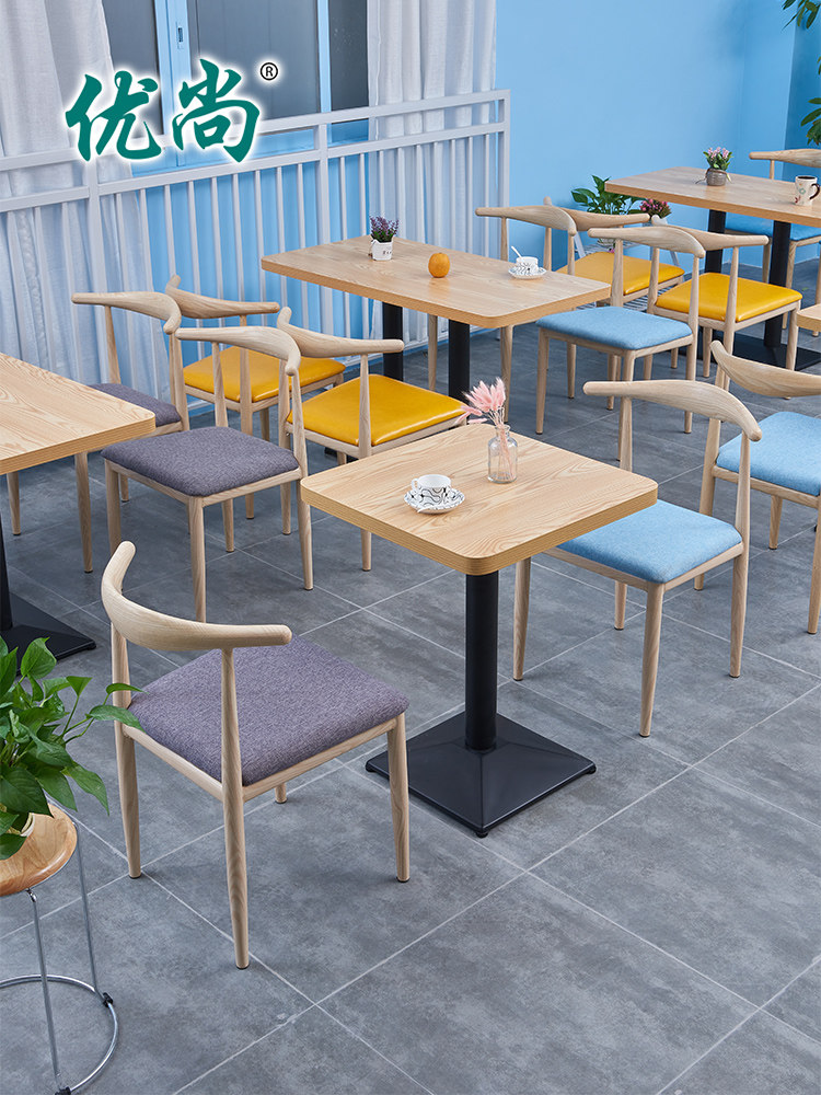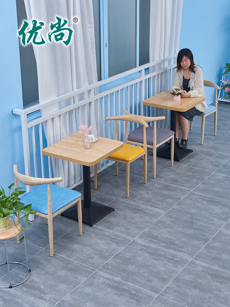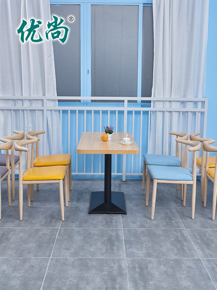 Iron Art Wood Grain Color Horn Chair (Black Leather) Original Wood Color Square Table Accessories Stainless Steel Base Iron Wood Color Horn Chair (Blue Leather) Original Wood Color Long Table Matching Black Base Original Wood Color Round Table Match Black Base Original Wood Color