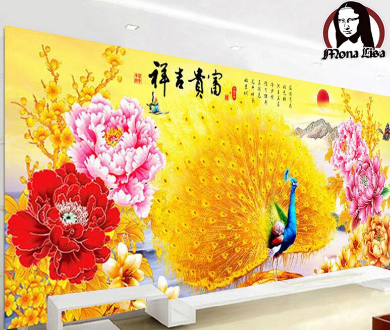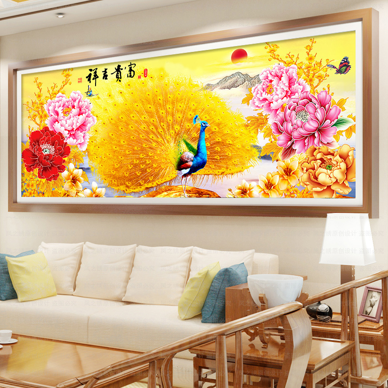 New version printed cross embroidered golden peony peacock chart living room office full embroidered big picture rich and expensive auspicious peacock painting