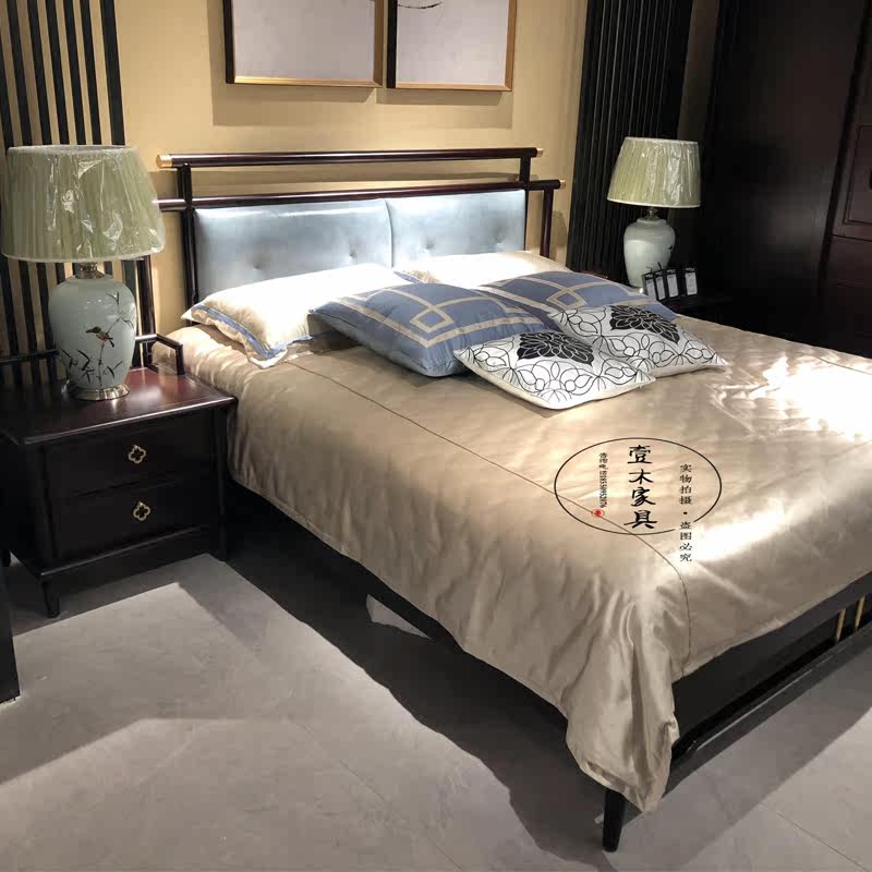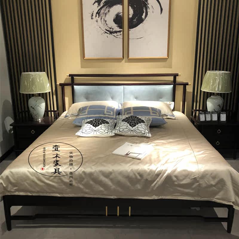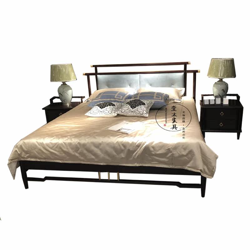 New Chinese-style solid wood bed 18m double bed Zen model room simple 15m leather wedding bed bedroom fabric bed