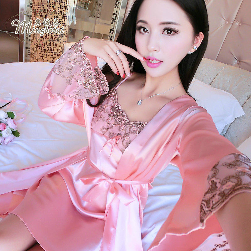 Spring and autumn silk nightdress nightgown short-sleeved pajamas women's summer ice silk long-sleeved sexy suspenders two-piece suit home service