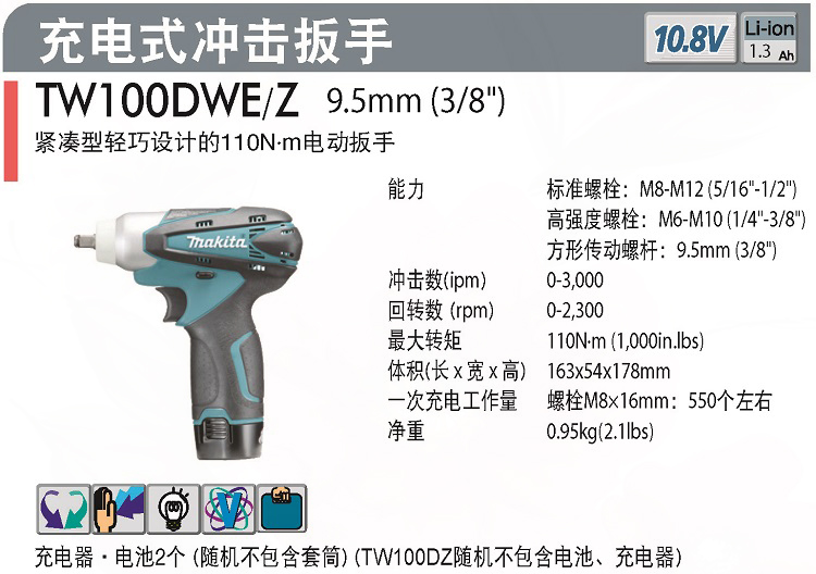 Pasture Charging Wrench TW100DZ DWE Windy Gun 3 8 square sleeve wrench 10 8V lithium