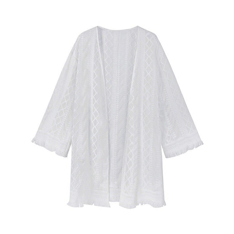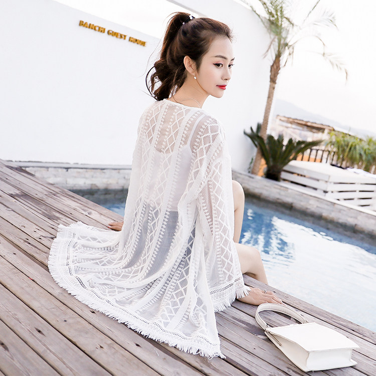 Chiffon sunscreen women's mid-length fringed lace cardigan top jacket plus size blouse white seaside outerwear