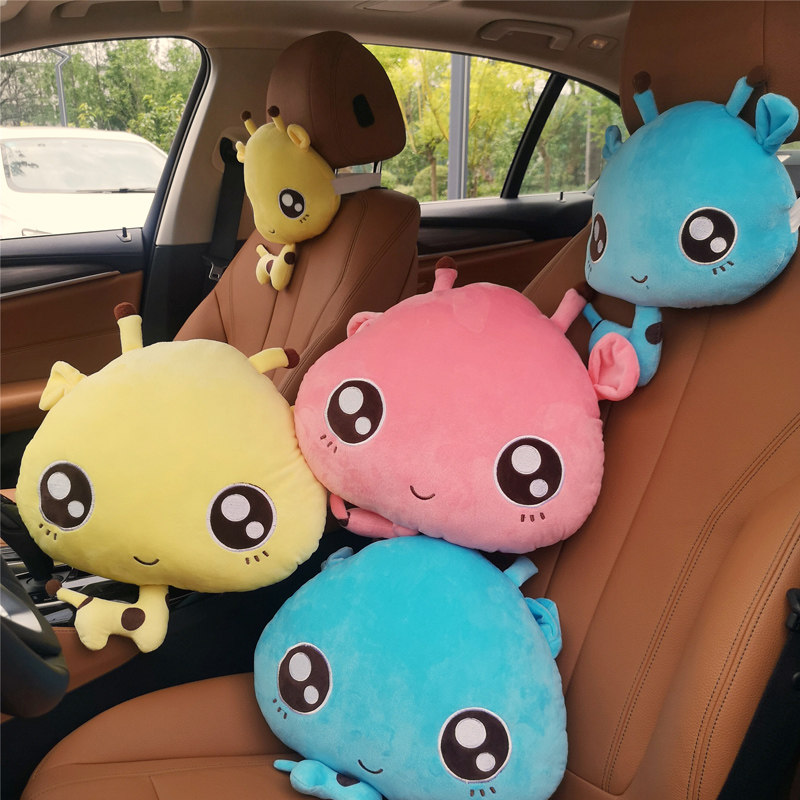 Pink pig, a yellow deer car pillow, a yellow deer car pillow, a khaki bear, a car pillow, a khaki bear