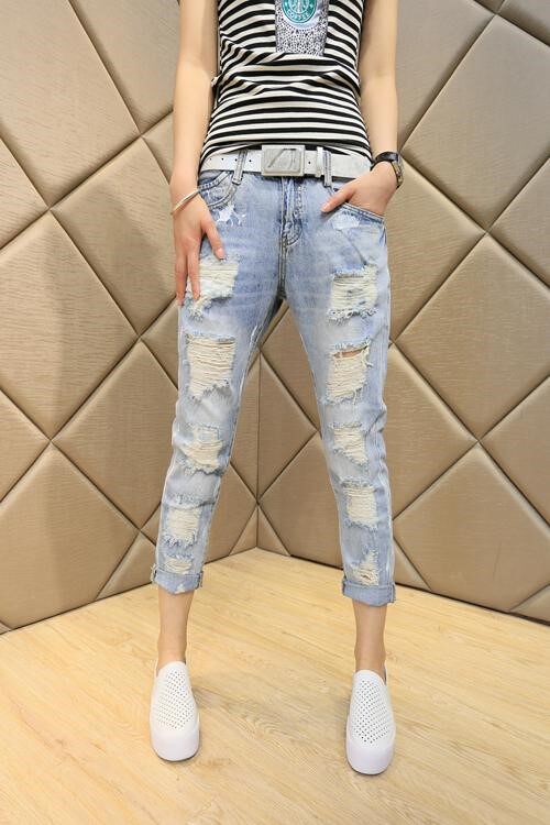 Hole jeans women's summer ultra-thin knee summer loose pants cropped pants large size light tide