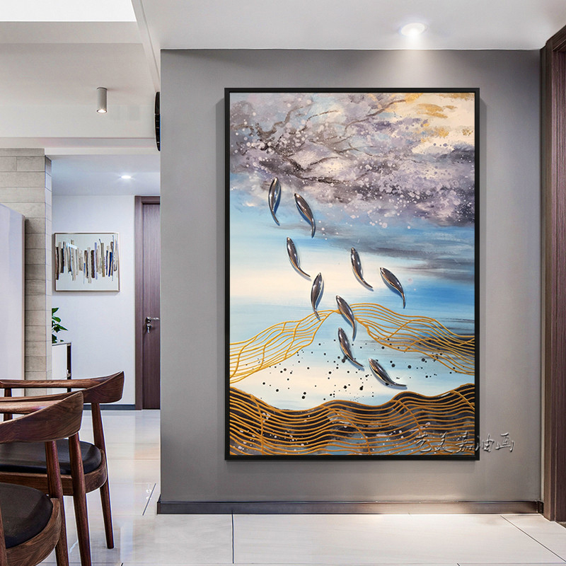 Physical Nine Fish Tut In Door Xuanguan Decorative Oil Painting New Chinese Corridor Aisle End Hanging Wall Light Extravagant and Abstract Vertical version