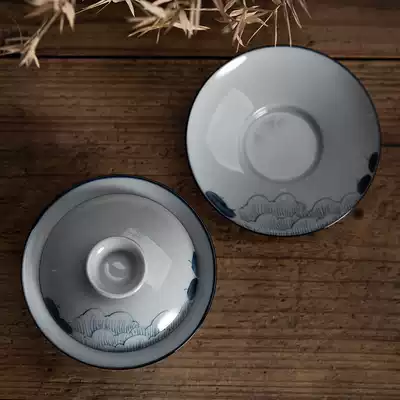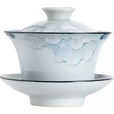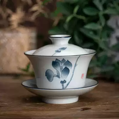 Wooden fish antique hand-painted blue and white hibiscus bowl Jingdezhen blue and white porcelain ceramic three Cai tea bowl kung fu tea set