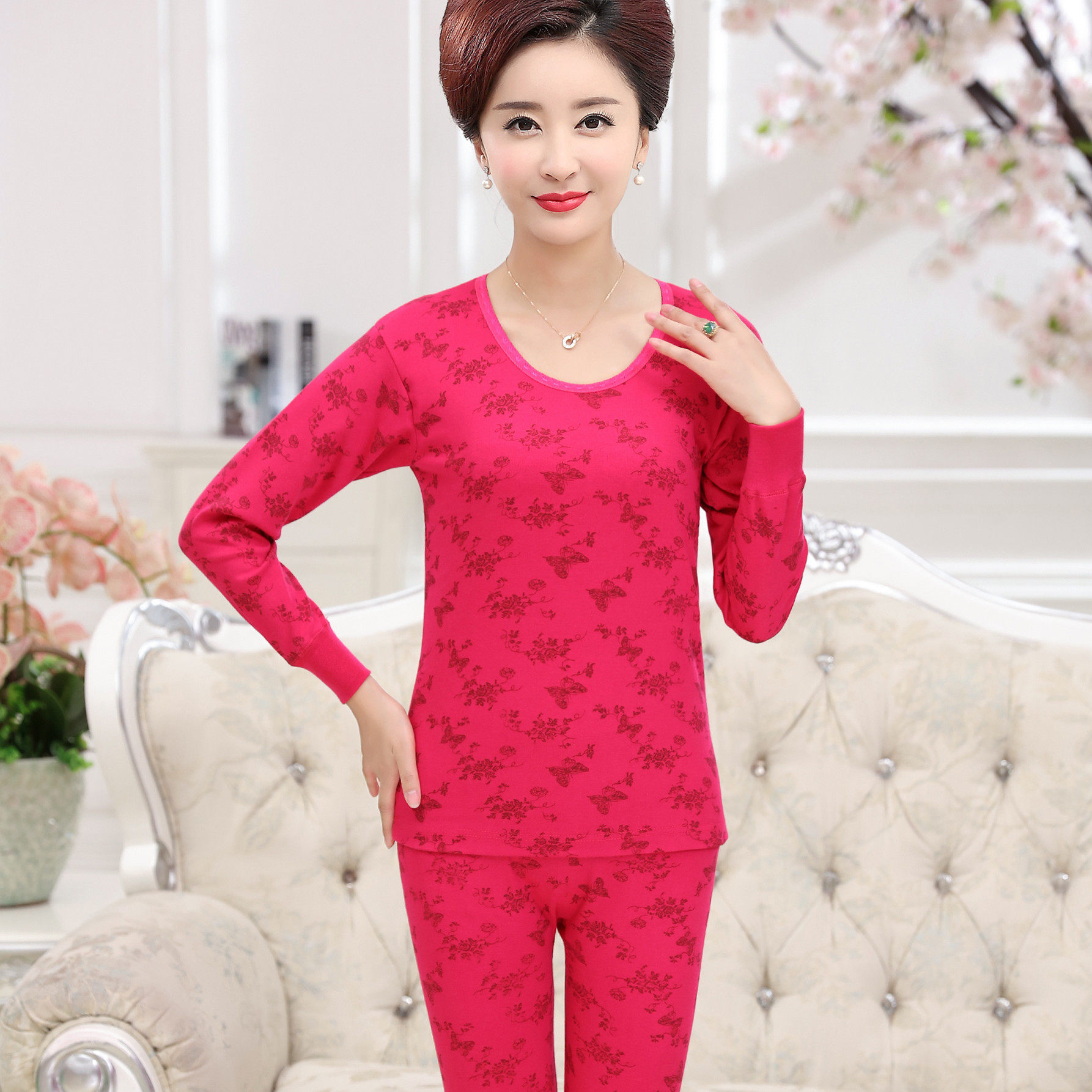 Middle-aged and elderly printed autumn clothes sanitary pants set women's cotton mom fever jacket 100% cotton large size medium high neck