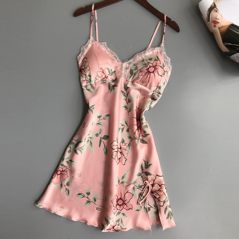 Sleepwear Woman Summer Ice Silk Adult Sexy Harness Sleeping Dress With Chest Cushion Coaling Small Breast Slim print 2022 Summer