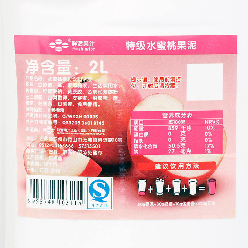 Milk tea raw material fresh water honey peach fruit puree jam water honey peach drink concentrated syrup 2L water honey peach pulp
