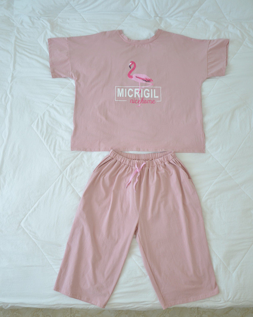 Clearance Summer Women Flamingo Pajamas Plus Size Loose Leisure Short Sleeve Capri pants Cotton Home Clothing 200 Jin