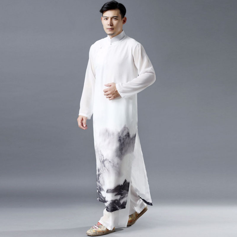 Chinese style summer Tang suit Hanfu men's retro slanted lapel plate button lay scholar elegant long gown robe costumes