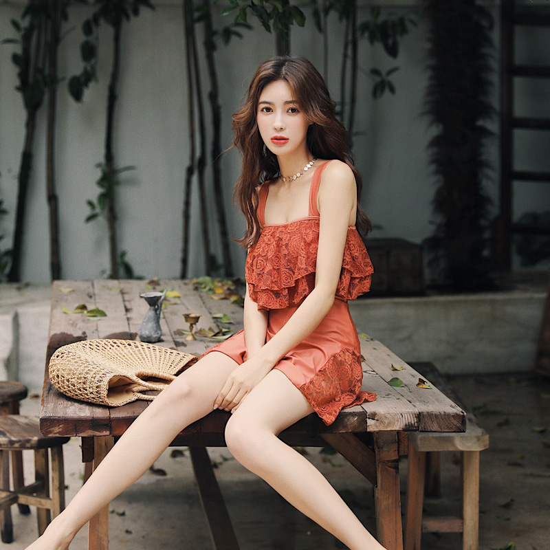 One-piece skirt swimsuit female ins wind Korean hot spring skirt ruffle small chest gathered to cover the belly thin conservative
