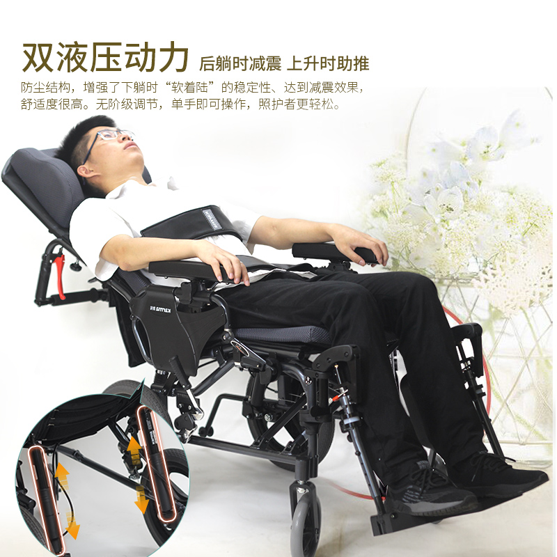 With handbrake Armrest can be lifted Foot pedal removable Anti-slip High backrest full lying High backrest half lying