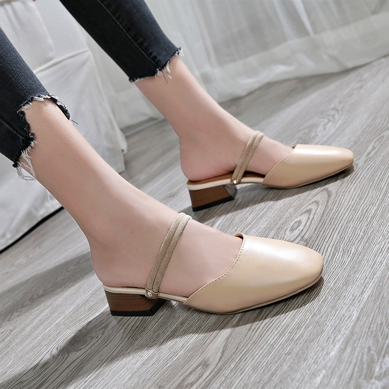 2020 summer new mid-heeled thick-heeled sandals and slippers women's two wear Baotou half slippers women's chic shoes women's Hong Kong style outer wear