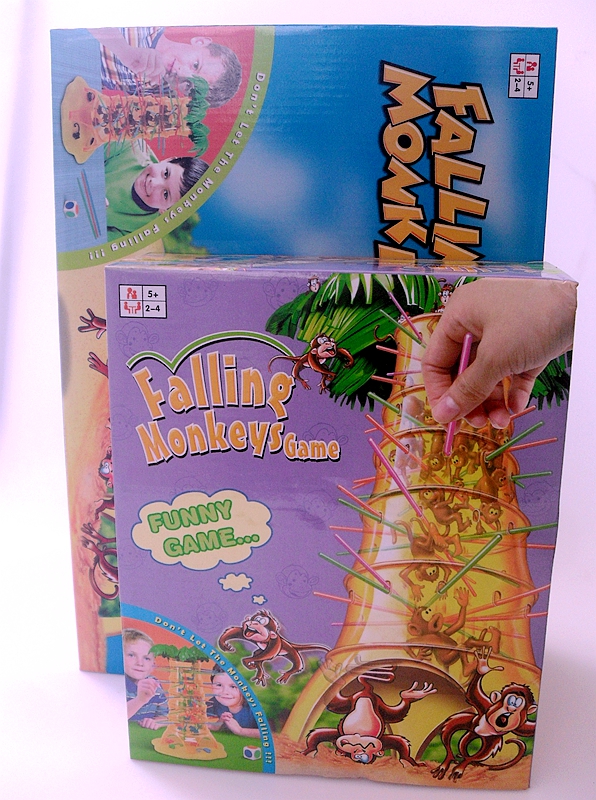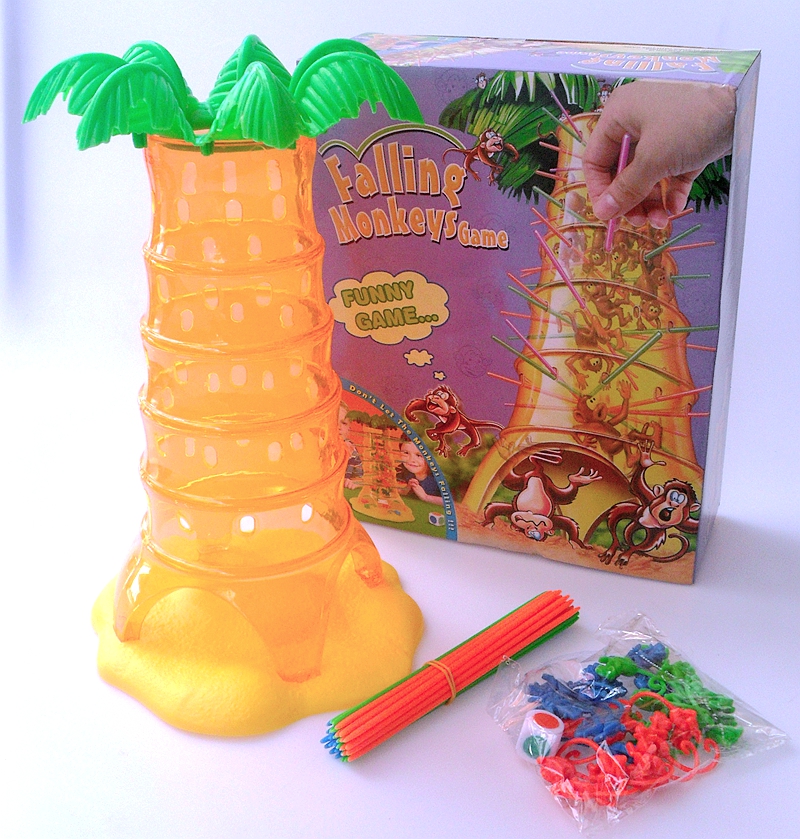 Big box comes standard with 30 colorful monkeys, 30 sticks, 1 large box of dice to upgrade to 60 colorful monkeys, 60 dice, 2 hourglasses, and 1 small box.