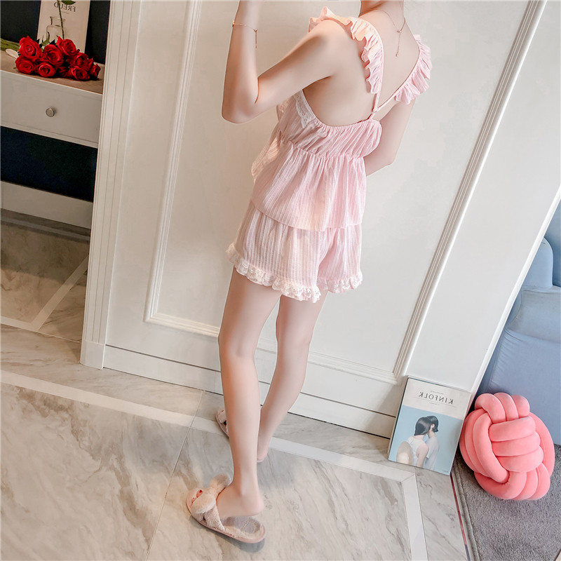 Korean version of cotton cute sweet and sexy pure cotton side suspenders shorts with chest pad women's pajamas set home service summer