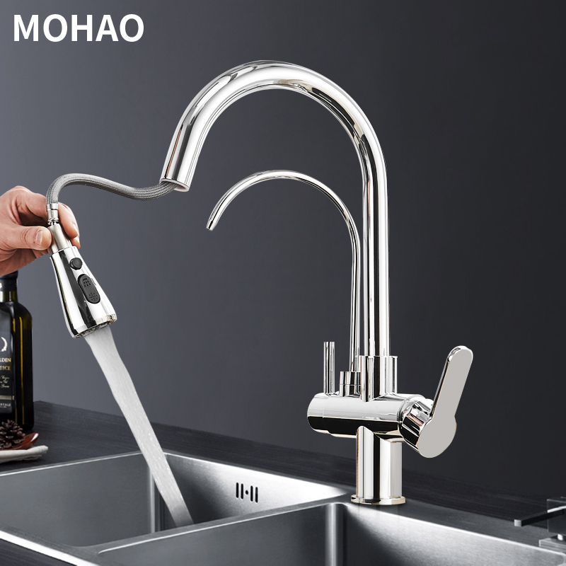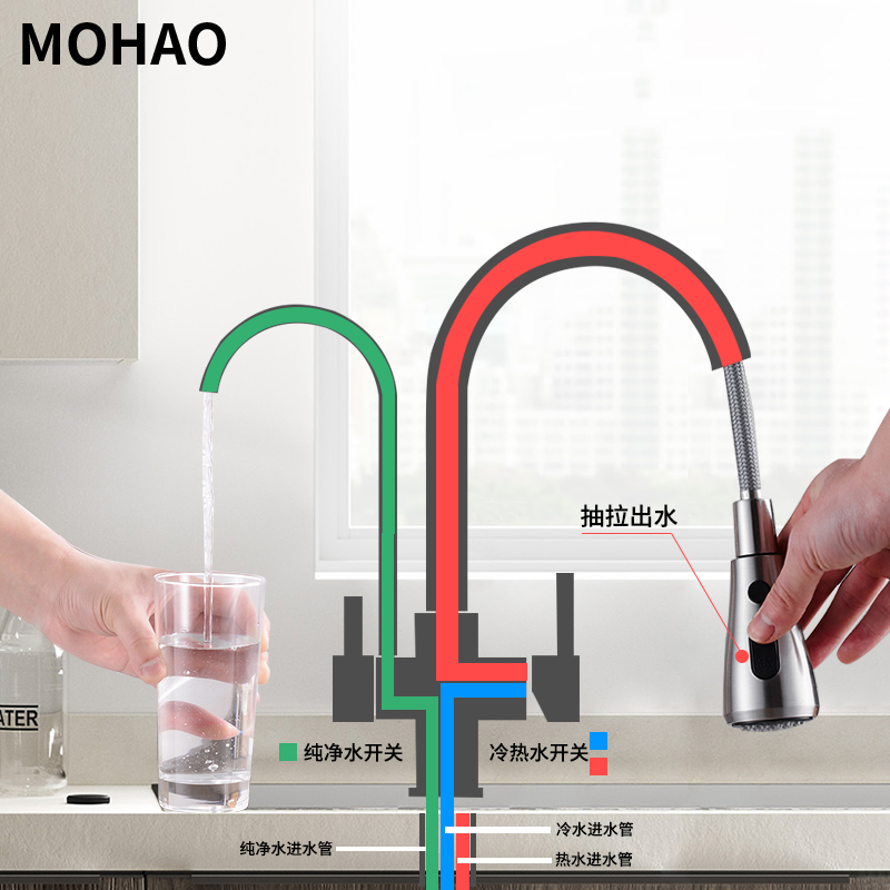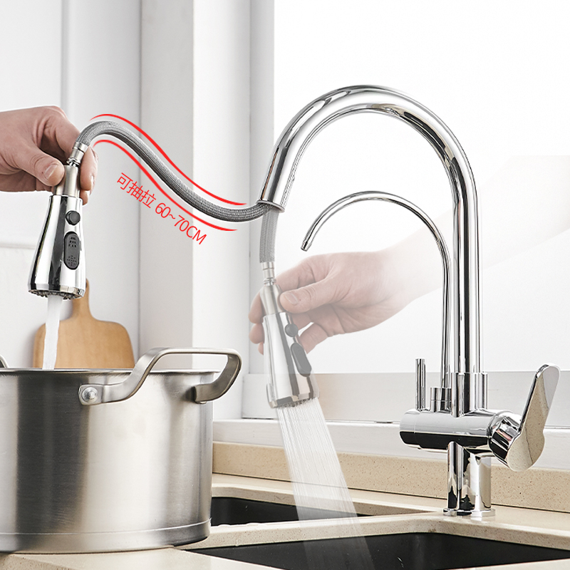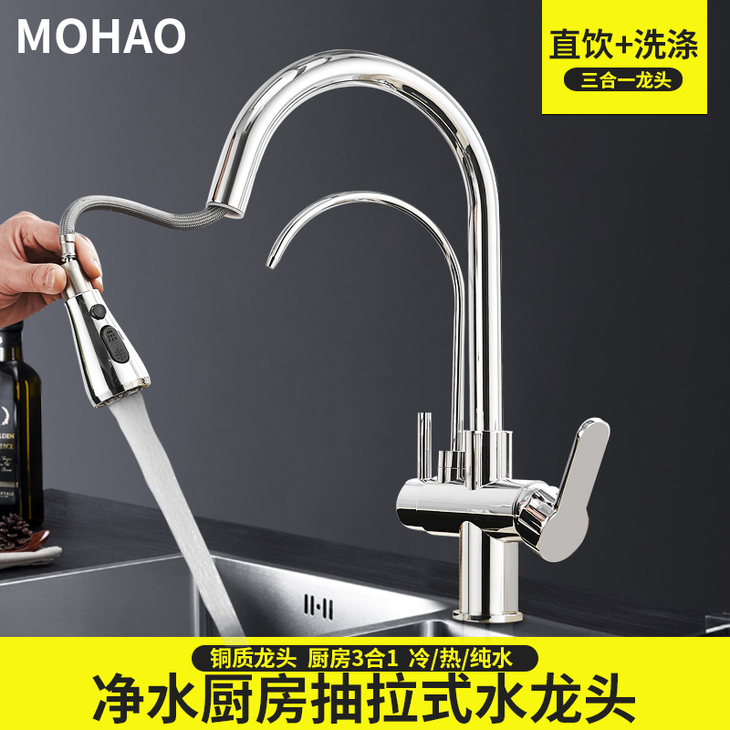 Kitchen hot and cold water faucet dishwashing basin water purifier pull-out straight drinking pure water domestic three-in-one double water outlet machine