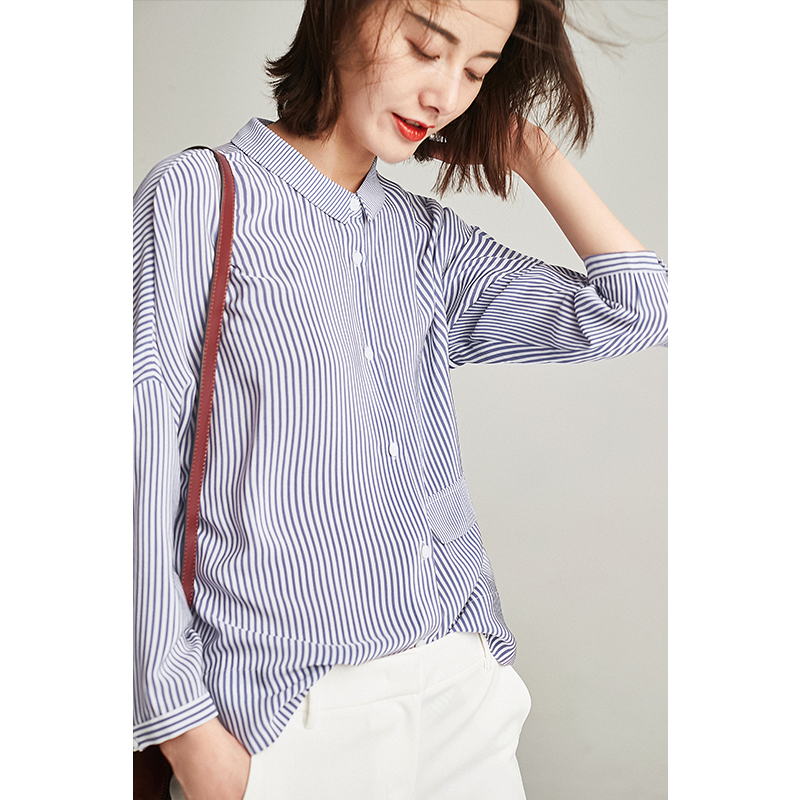 BEEWOOD Beutong original design women's dress true silk long sleeve shirt blue striped loose shirt blouse