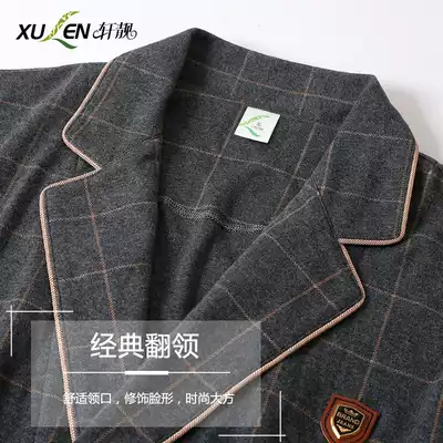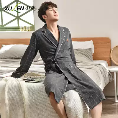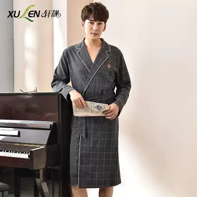 Pajamas male spring autumn cotton long sleeve gown cardigan casual plaid cotton bathrobe loose large size home clothing winter