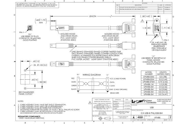 USB cable B type head panel installed Type B ahead 0 3m~5mUPMBB-05M