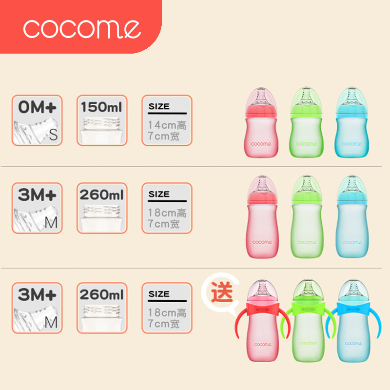 150ML powder comes standard with S pacifier 150ML blue comes standard with S pacifier 150ML green comes standard with S pacifier 260ML blue comes standard with M pacifier 260ML green comes standard with M pacifier 260ML