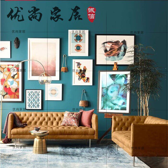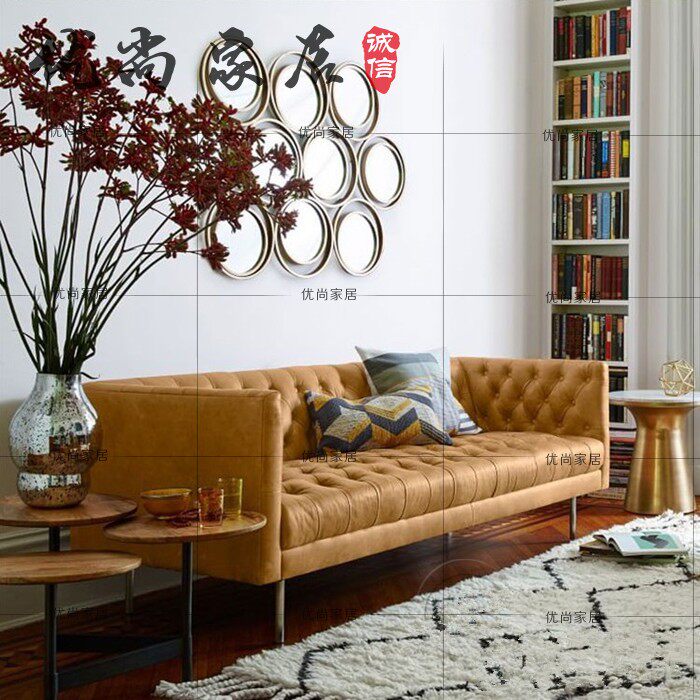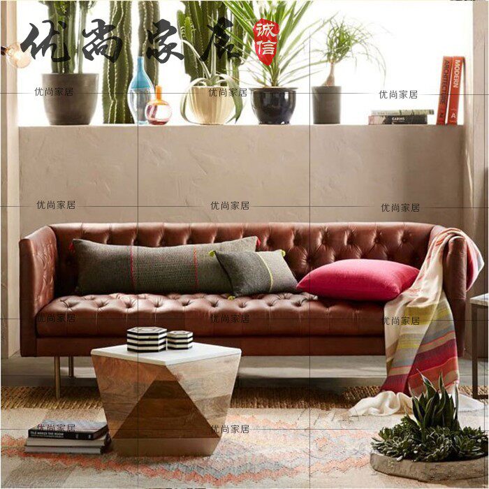 American retro buckle leather sofa model living room small apartment modern crack double three-seat combination sofa