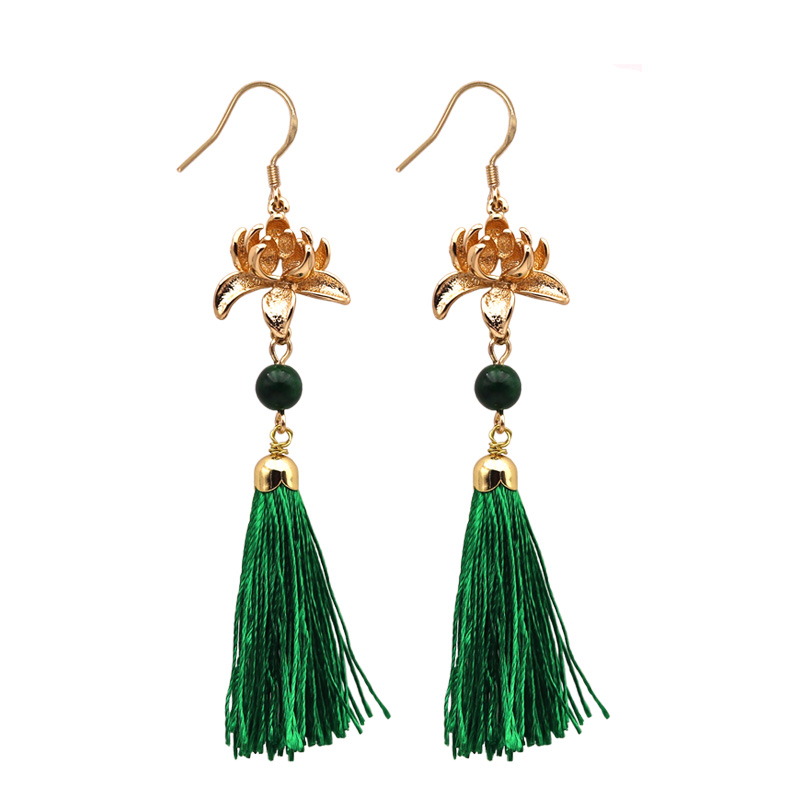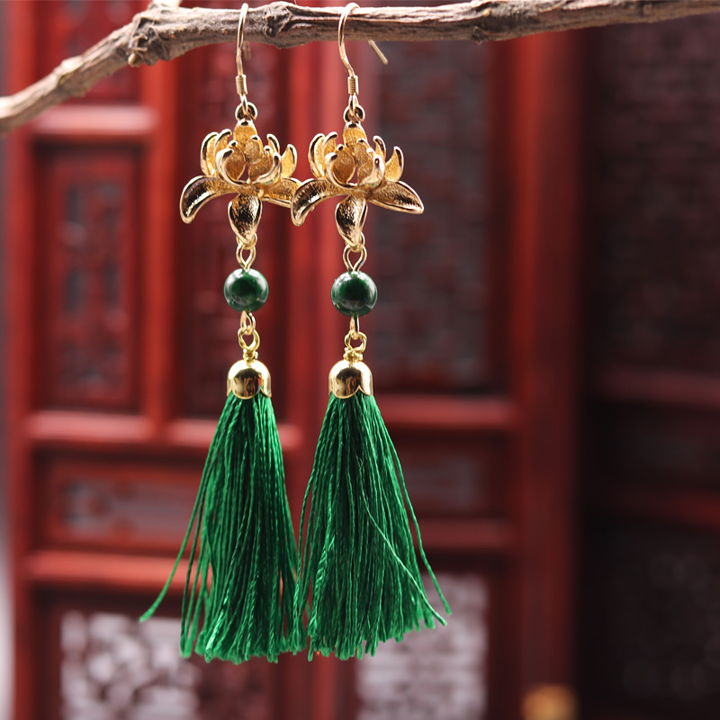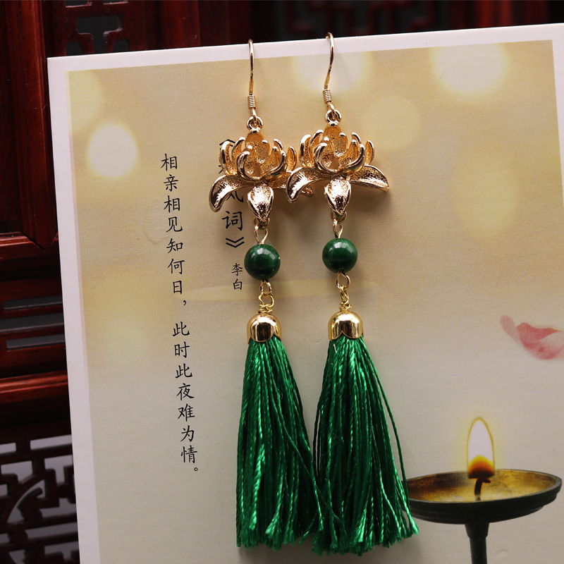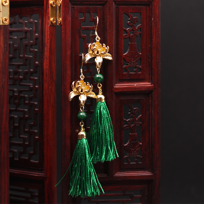 Chinese national style classical chrysanthemum earrings long version tassel atmospheric earrings niche elegant earrings dark green antique style