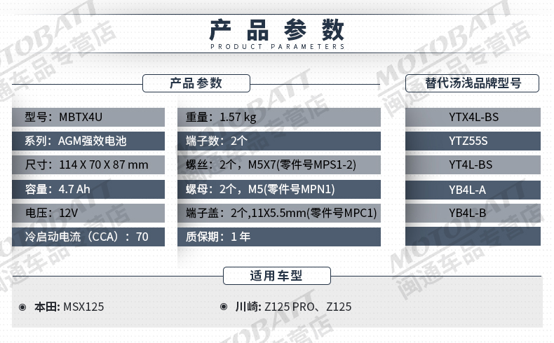 Honda MSX125 Grom 125SF 125F Monkey Monkey 50 Z50 Locomotive battery 12V Universal