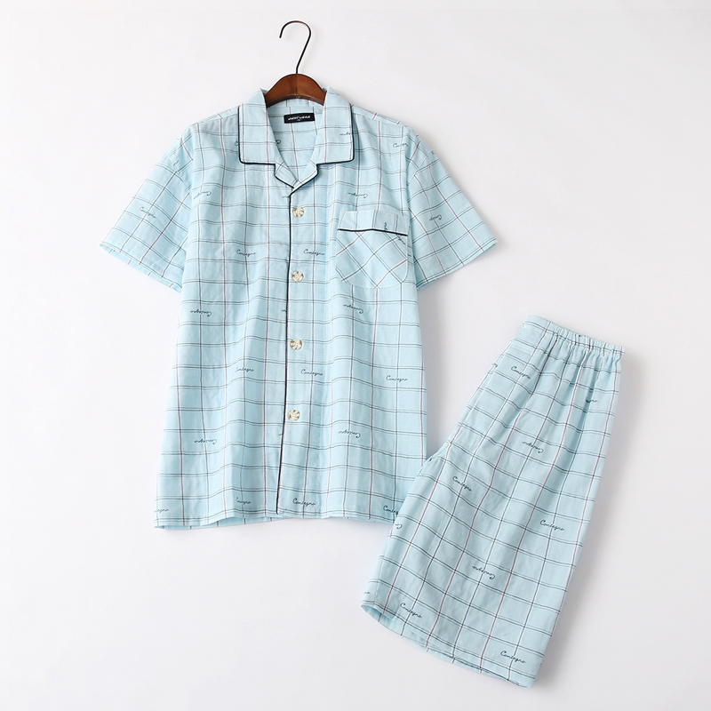 Summer slim full cotton double layer gauze Men's short sleeve shorts Pyjamas Pure Cotton Japan checkered home Suits Suit