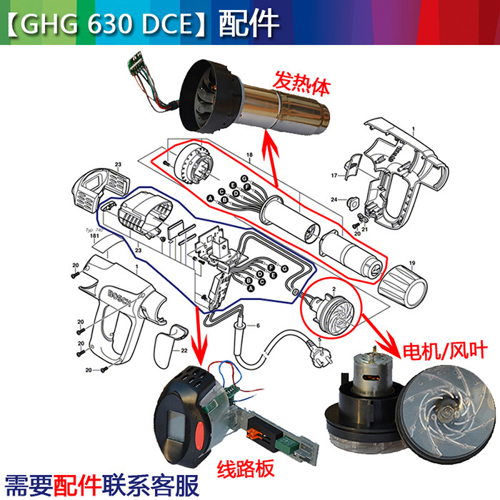 Open ticket Bosch Thermal wind gun GHG 630DCE Motor heating elements Number of display switches GHG 500-2