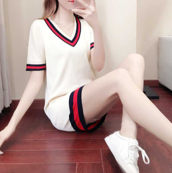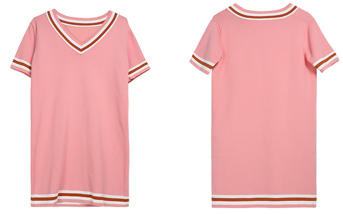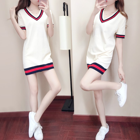 Hong Kong 2021 Summer Female Summer Ice Wire Dress College Wind - College Wind - College of Long - College V - collar Strip T - shirt