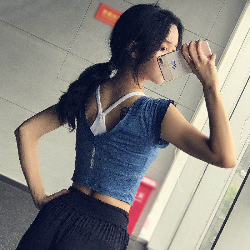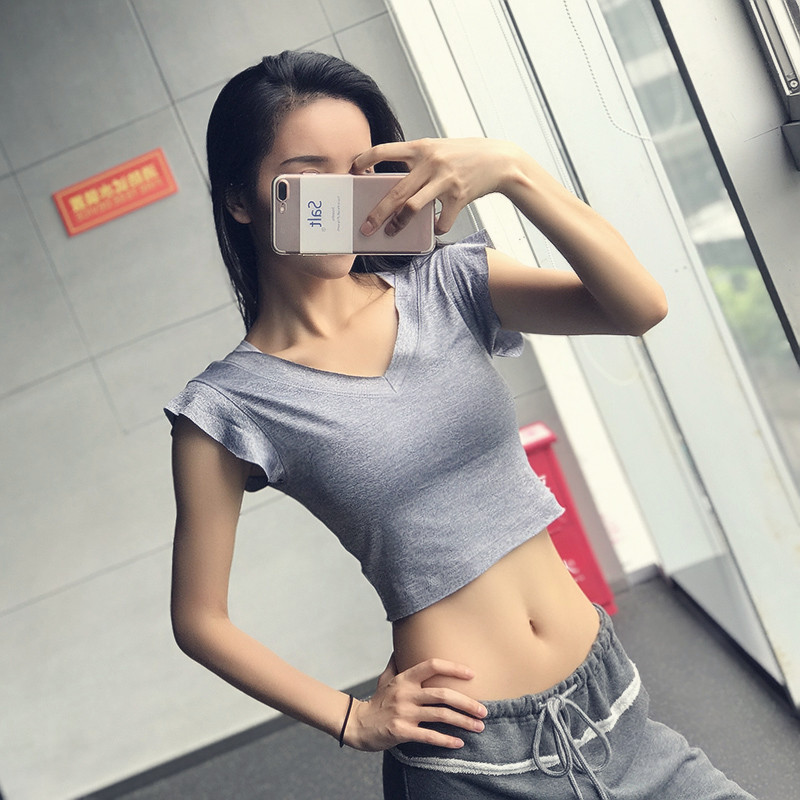 Fitness clothes women's t-shirt sports top women's umbilical short-sleeved bottoming shirt V-neck tight running short yoga sleeveless