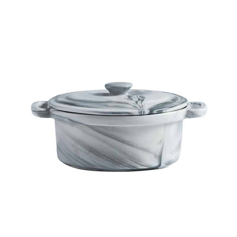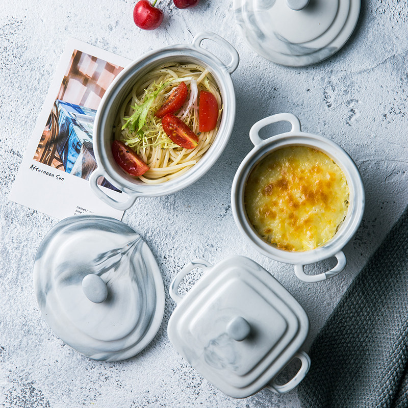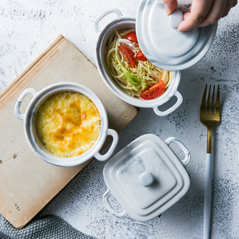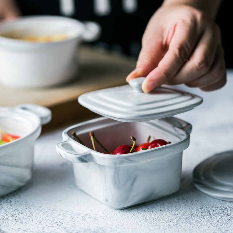Nordic double ear with lid ceramic pudding bowl sweet bowl sweet bowl ice cream bowl marble grilled bowl Steamed Egg Bowl Baking Bowl