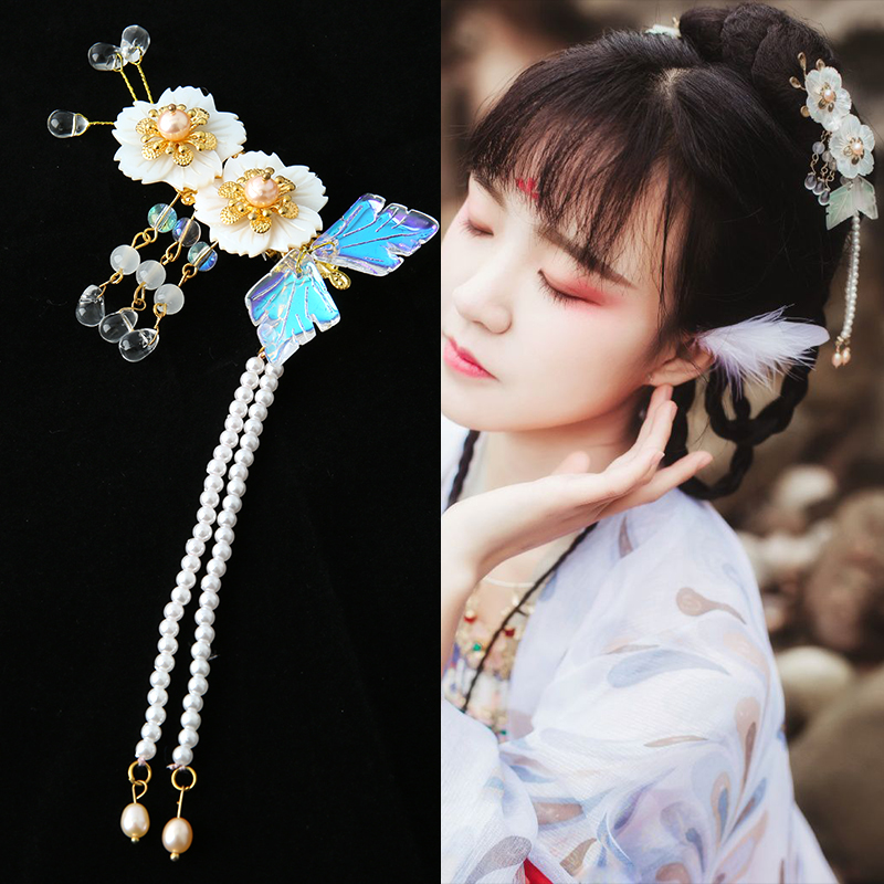 White beads 01 slim silver pendant comb with slim silver pendant clip with 04 blue butterfly clip a white bead lotus hairpin A silver butterfly hairpin a white shell clip a 09 white