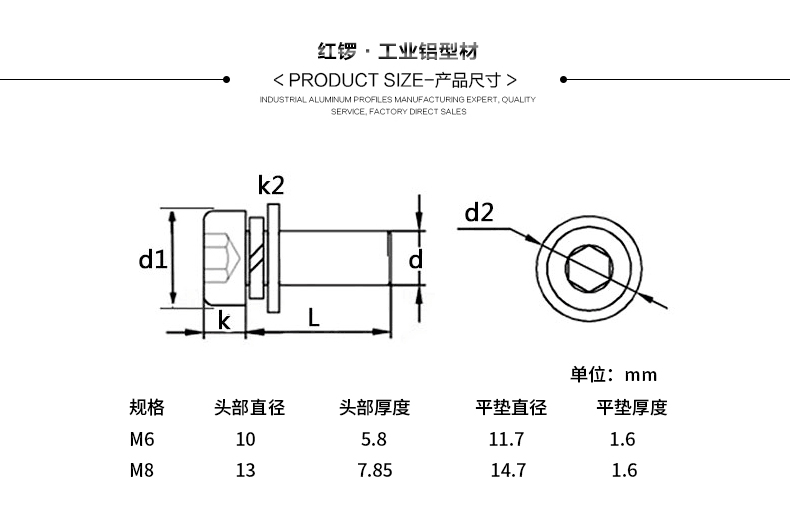 Red Gong industrial aluminum extrusion material accessories Stainless steel non-knurled cup head hexagon M8 three combination screw bolt M6