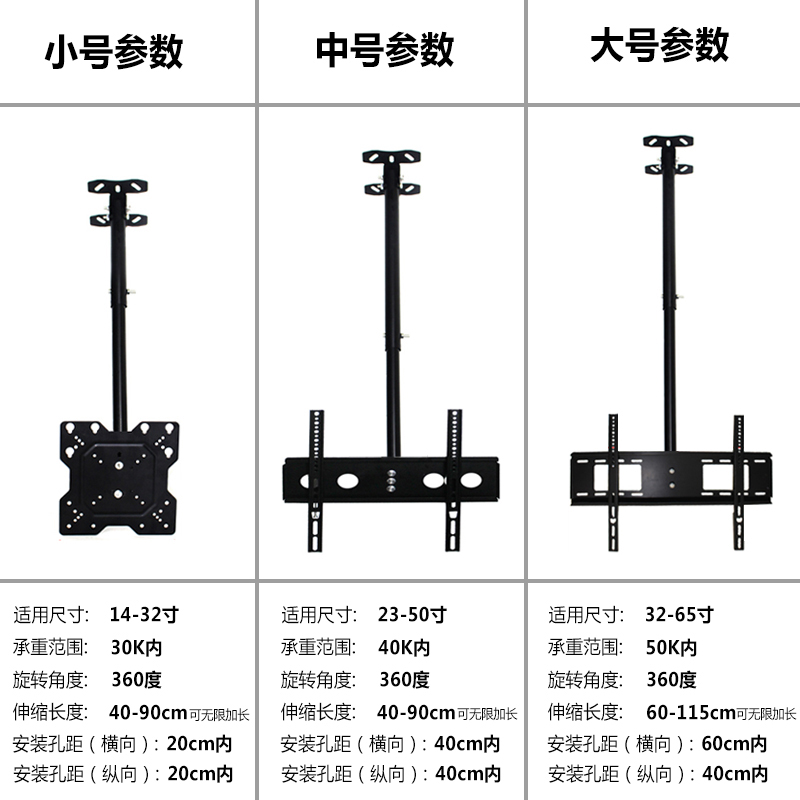 Standard small (telescopic range 40cm-90cm)Extended small (telescopic range 40cm-190cm) A set of extension rods(adjustable lengthening 0 5~1M) Standard medium