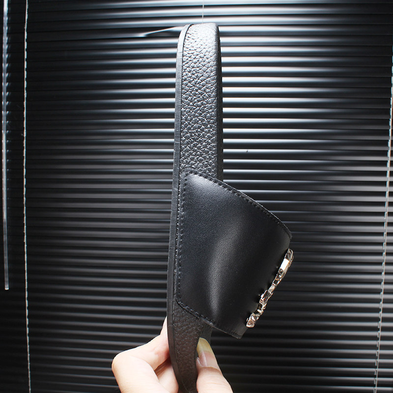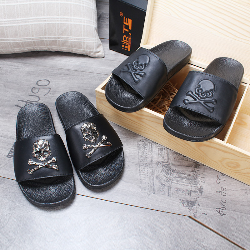 Summer outwear Tide Cards Genuine Leather Men Slippers Personality Skulls Head Outdoor Non-slip Soft Bottom Sandals Beach Lined