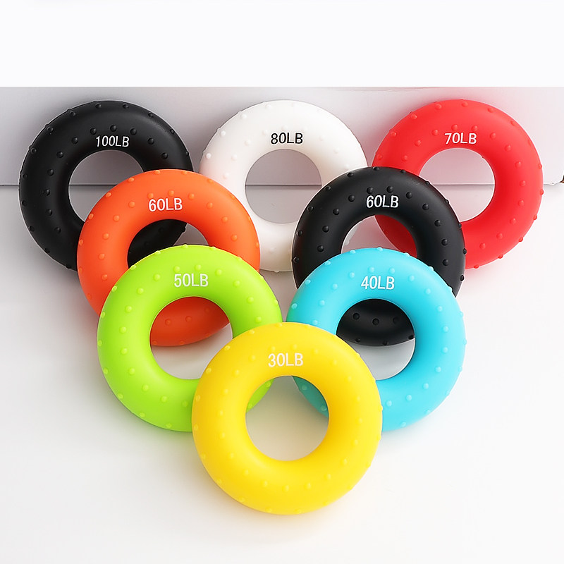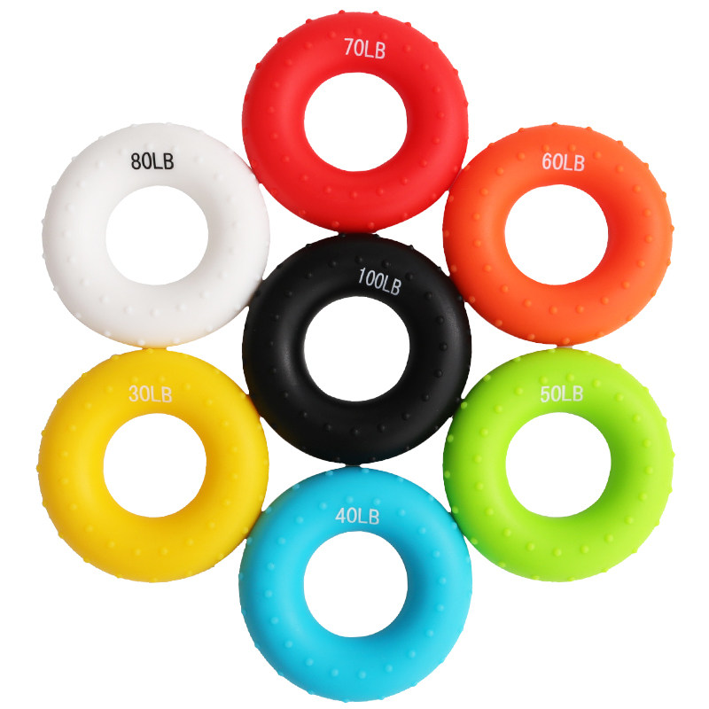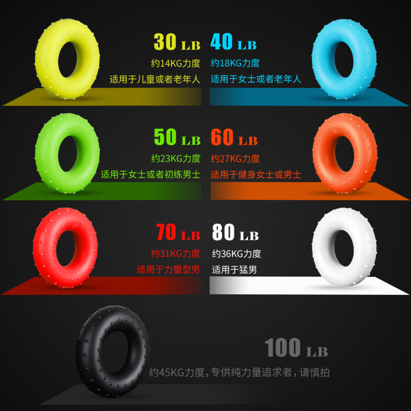 30 pounds Yellow (for children or seniors) 40 pounds Blue (for women and seniors) 50 pounds Green (for women and men) 60 pounds Orange(for fitness ladies and
