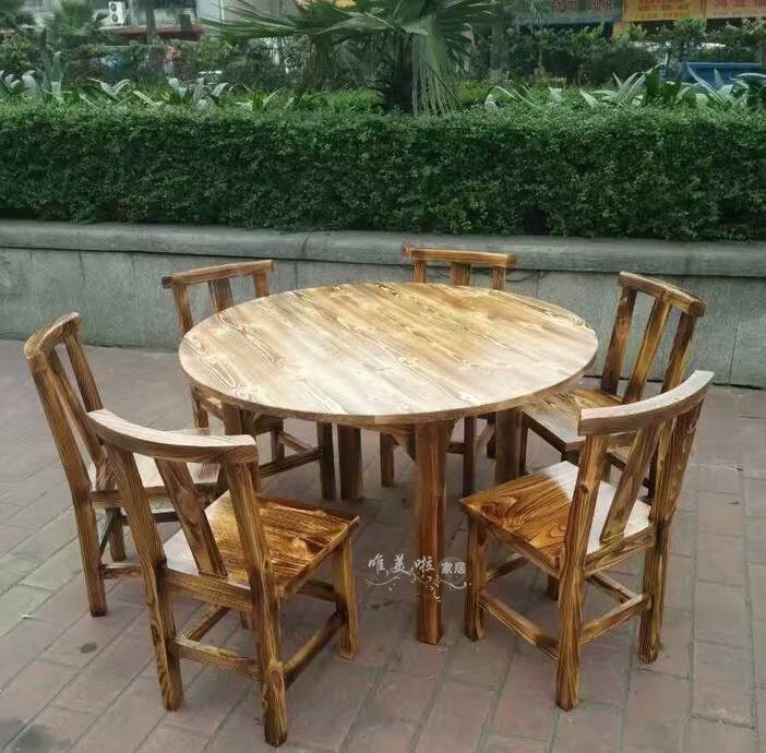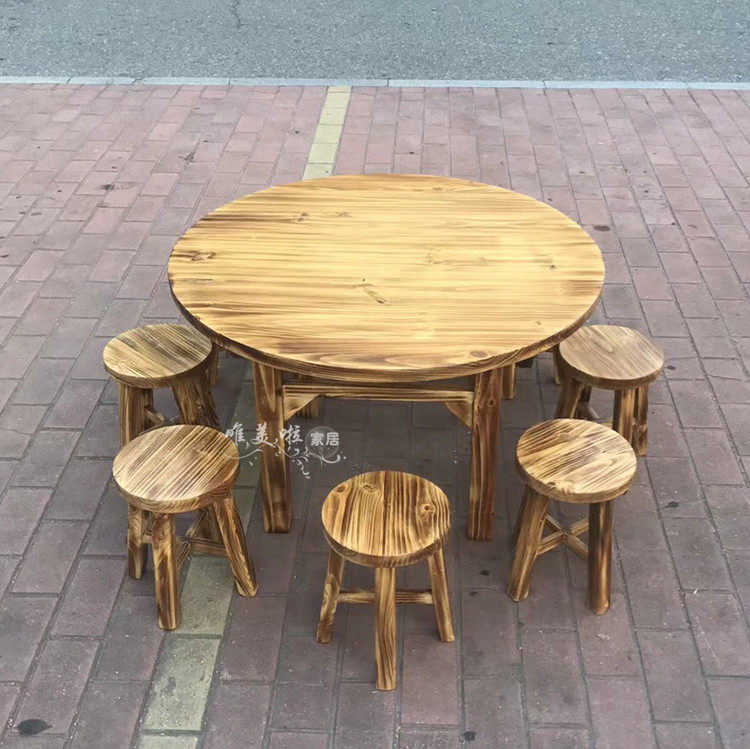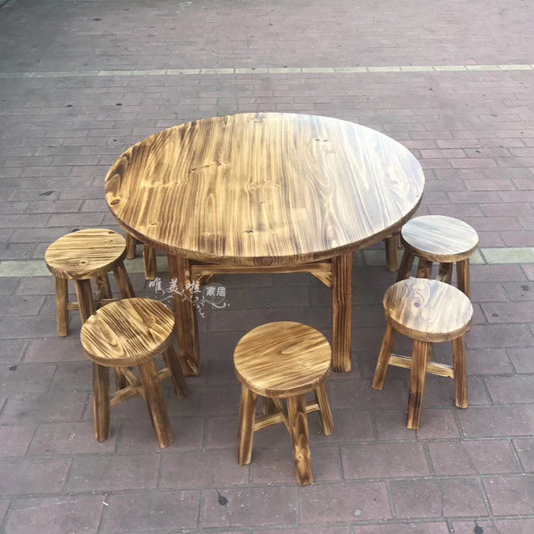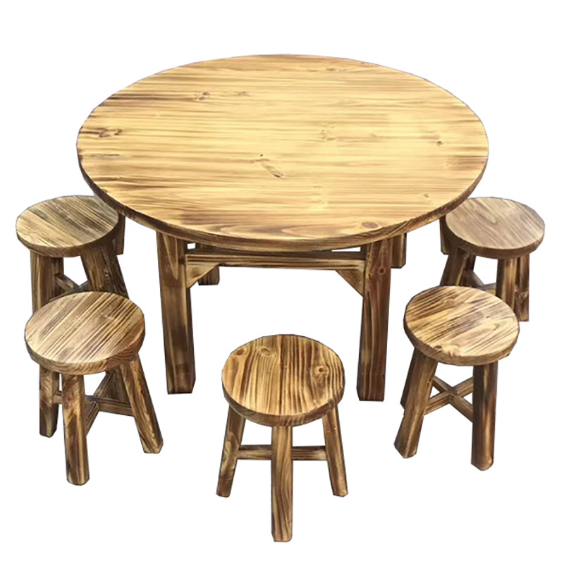 Carbonized hotel food stall restaurant round table Northeast pine all solid wood hot pot table charcoal fire wood table round stool