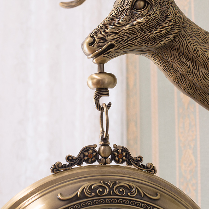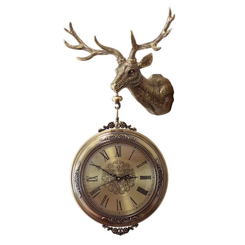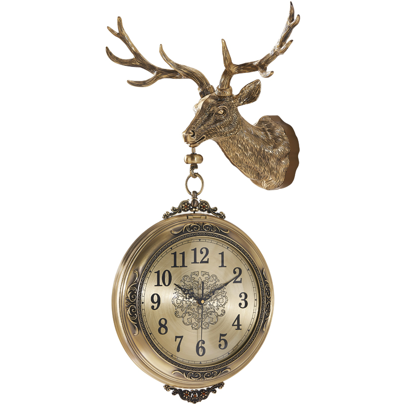 Living room European-style bifacial deer head hanging bell brass color muted American clock home big number decorative two-faced quartz clock