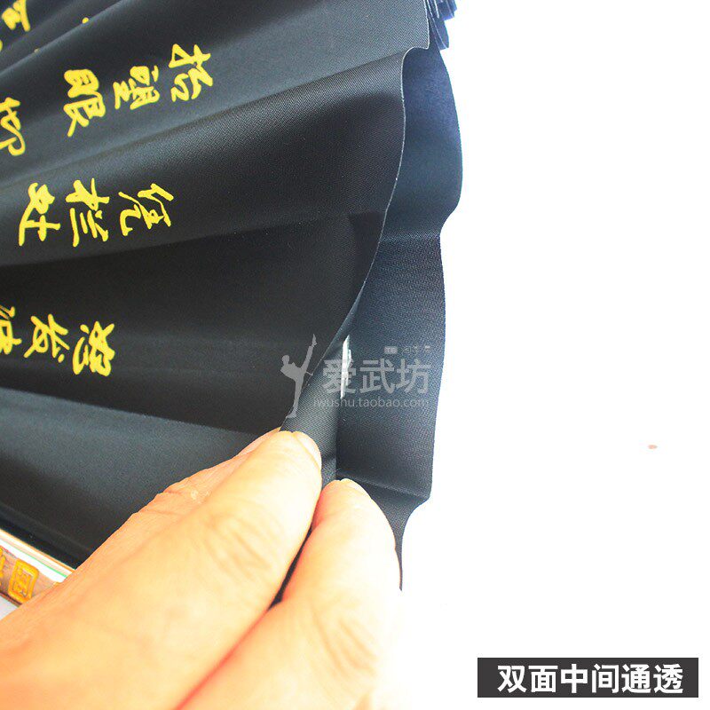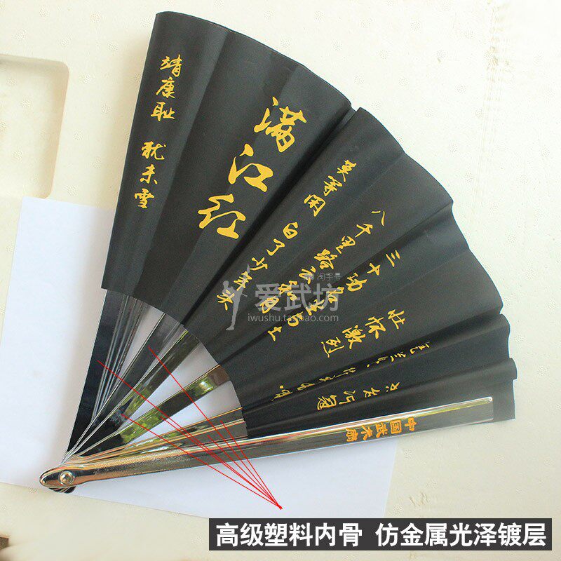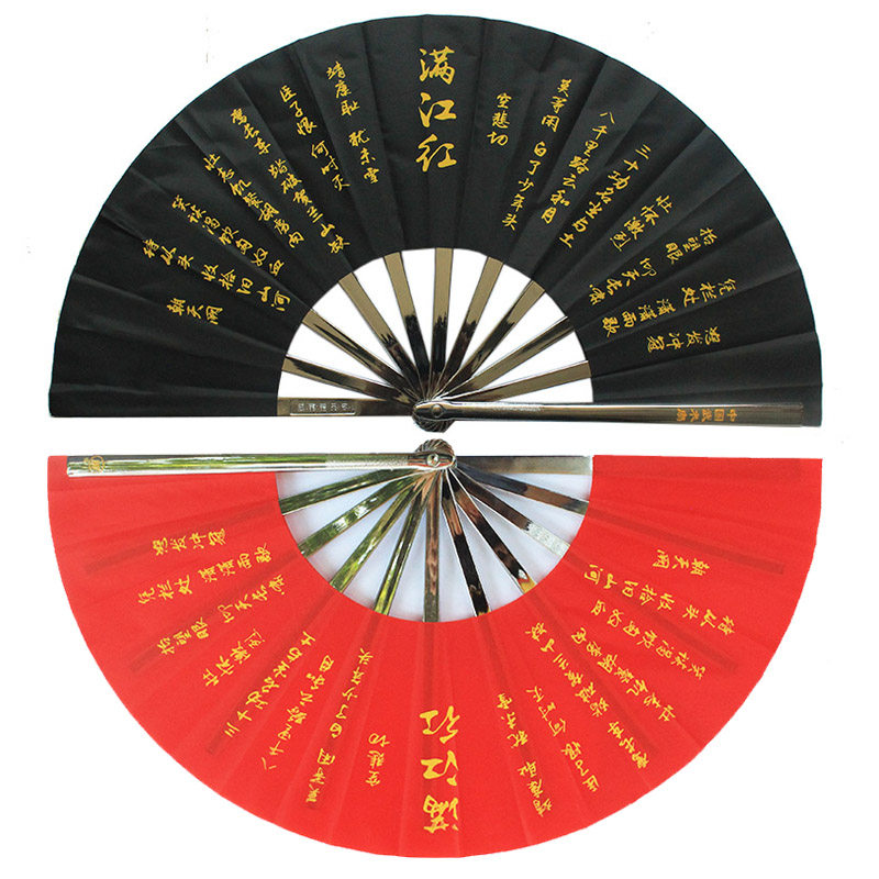 Double-sided tai chi fan Martial arts fan Kung fu fan Stainless steel outer bone plastic inner bone Yue Fei Manjianghong Jingzhong serve the country