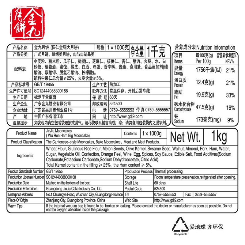 Wheat flour Glutinous rice flour Melon seed kernels Olive kernels Sesame kernels Walnuts Almonds Pork ham Water White sugar Vegetable oil Soy sauce White wine Eggs Candied edible salt Orange peel spices