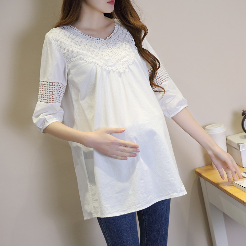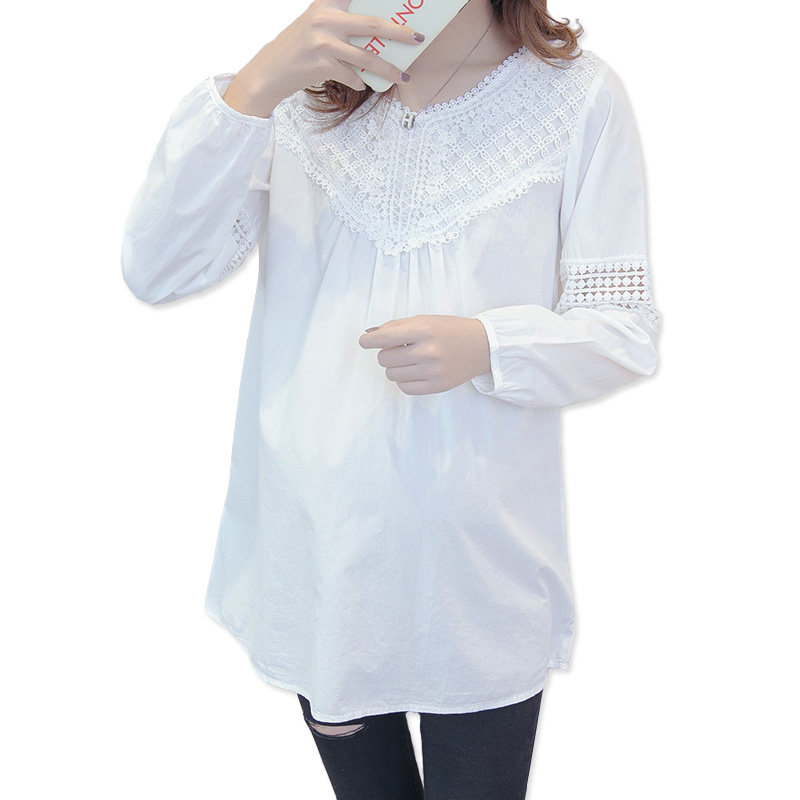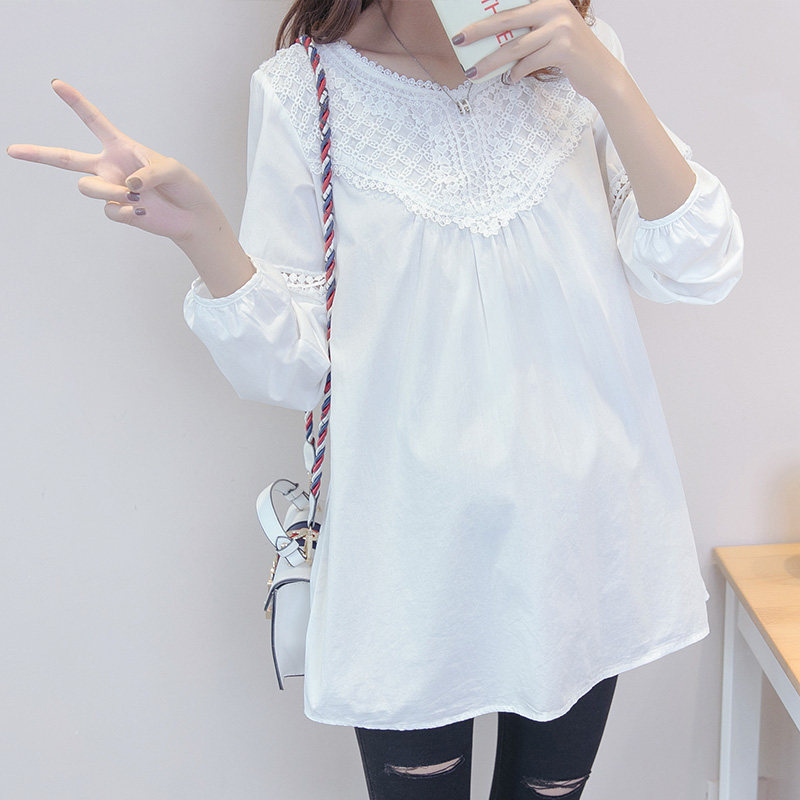 Pregnant woman autumn summer clothes new long sleeves T-shirt white lace blouses in a long version of a minimalist career mom loaded with undercoat