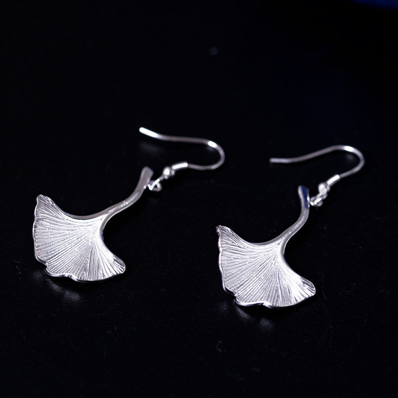 Silver Fans Design Gufeng Ginkgo Leaf Brief Earrings s925 Silver Expats Slim Earrings Woman Temperament Long Version Ear Hook Earrings