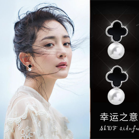 925 pure silver four - leaf ear nails 2023 new tide earrings of Korean pearl ear crash temperament